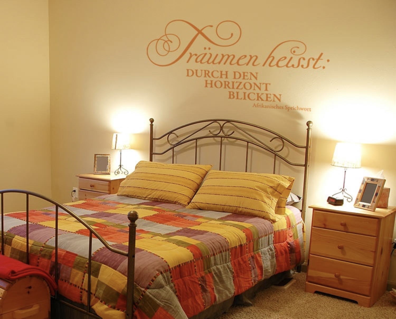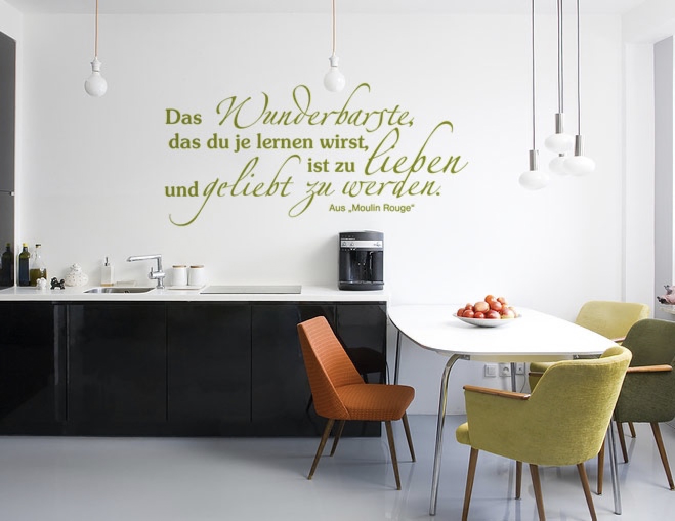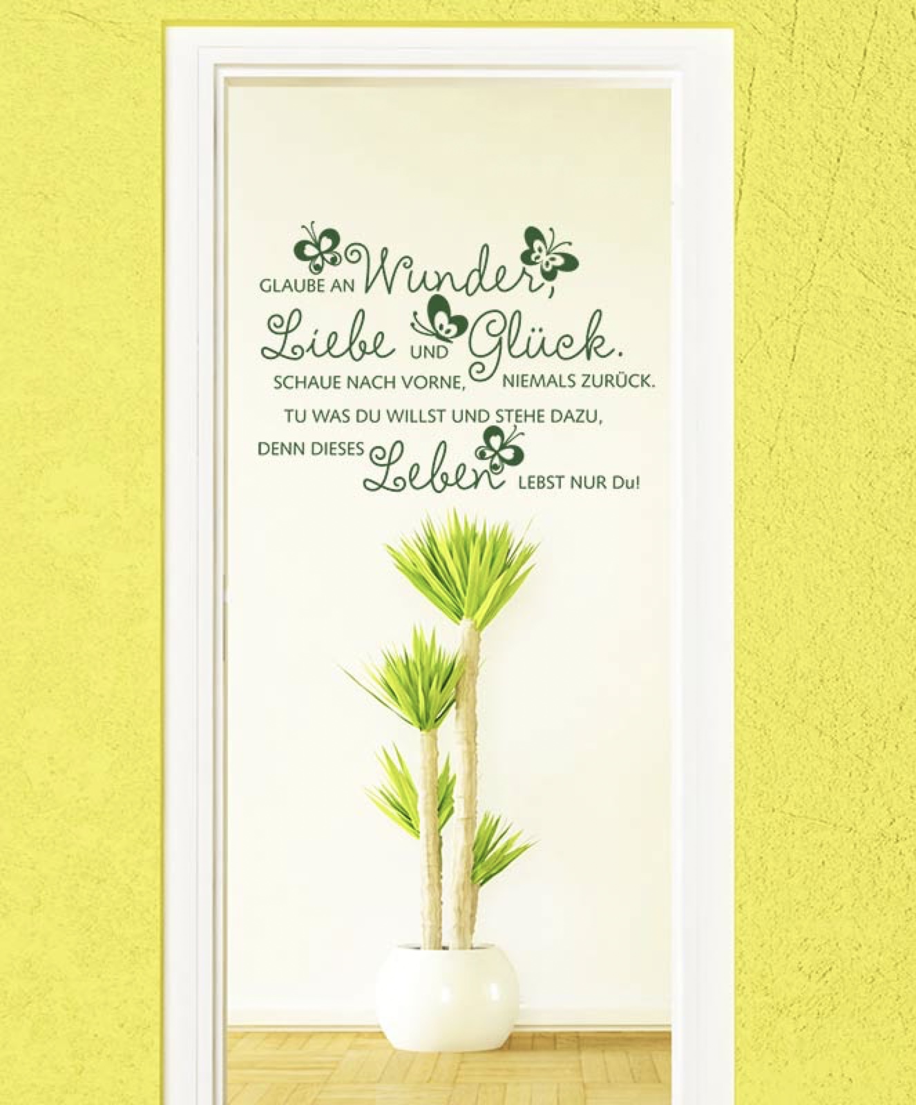 Diese Wandtattoo-Zitate dienen zur Erinnerung an Dinge, die einem persönlich wichtig sind und erinnern immer wieder an das Wesentliche. Sie ermutigen, bauen auf, erheben die Gedanken. Sie erinnern immer wieder daran, wohin man kommen will, oder wie man sein Leben ausrichten will. Bei uns finden Sie fertig gestaltete Wandsprüche und Zitate, speziell für Sie entworfen: wunderschön gestaltete Wandsprüche zum Nachdenken und zum Träumen. Mit unseren Wandtattoosprüchen setzen Sie stilvolle Designakzente in Ihren Wohnräumen.