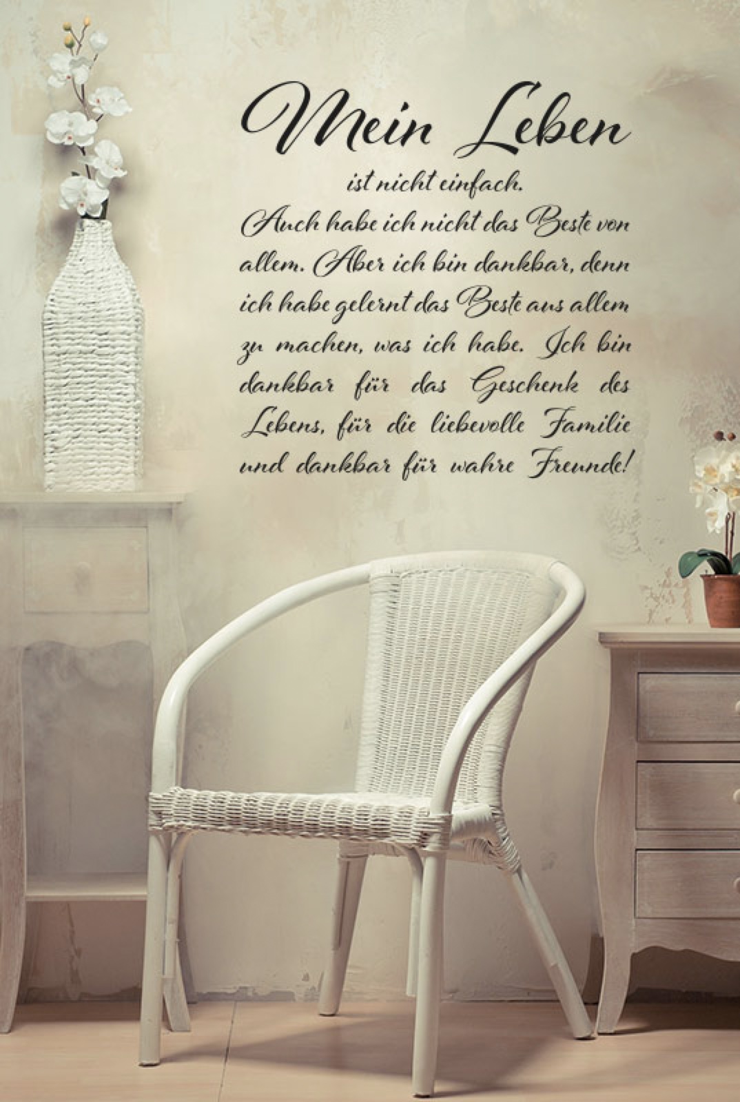 Wandtattoo Mein Leben ist nicht einfach. Auch habe ich nicht das Beste von allem. Aber ich bin dankbar, denn ich habe gelernt das Beste aus allem zu machen, was ich habe. Ich bin dankbar für das Geschenk des Lebens, für die liebevolle Familie und dankbar für wahre Freunde!