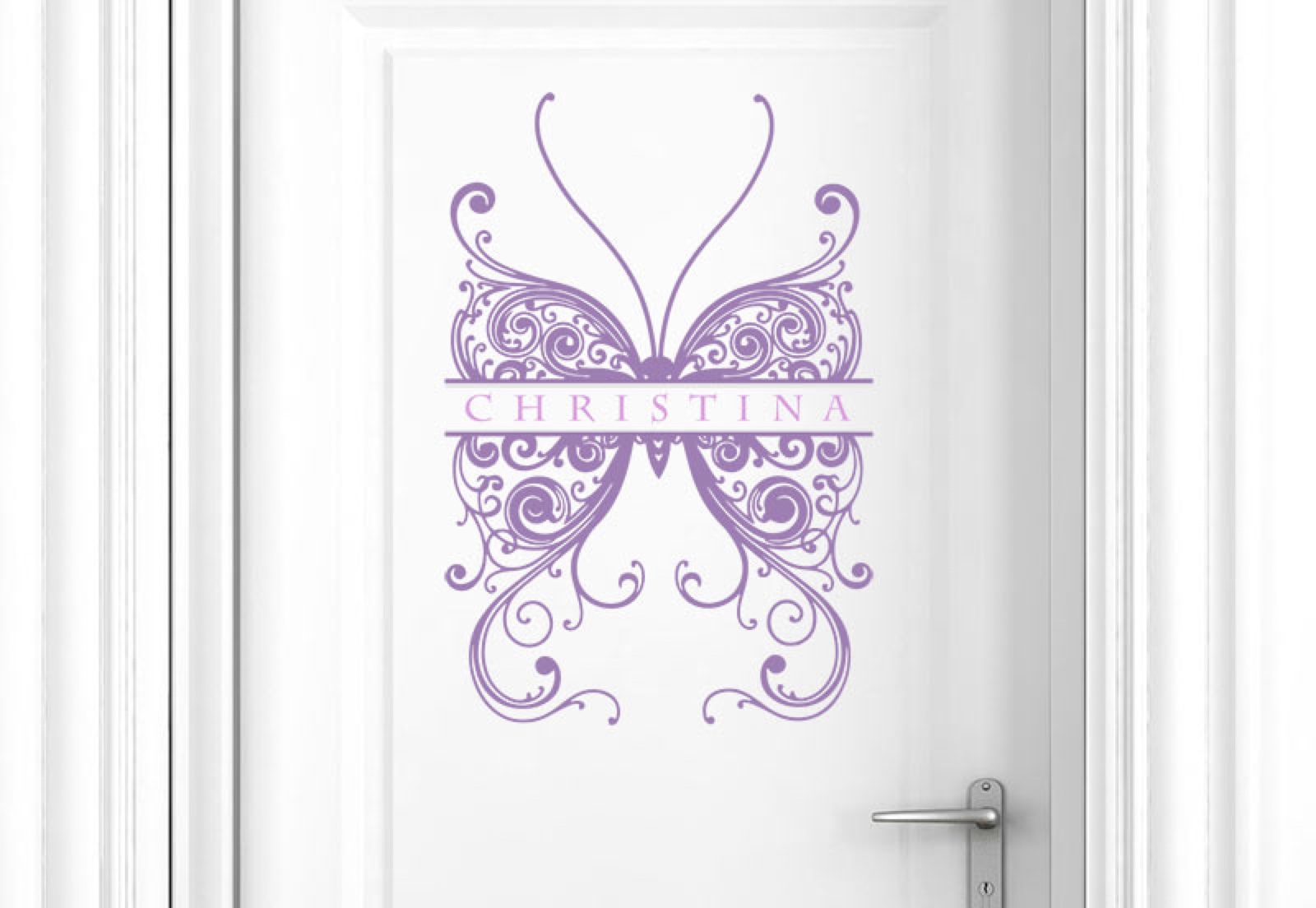 Wandtattoo Name mit Schmetterling Wunderschöner Schmetterling mit individuellem Namen als Türverzierung. Zweifarbig nach Wunsch.