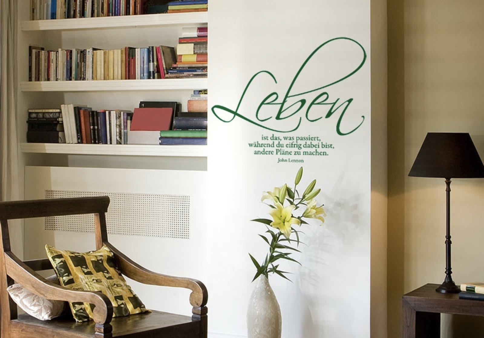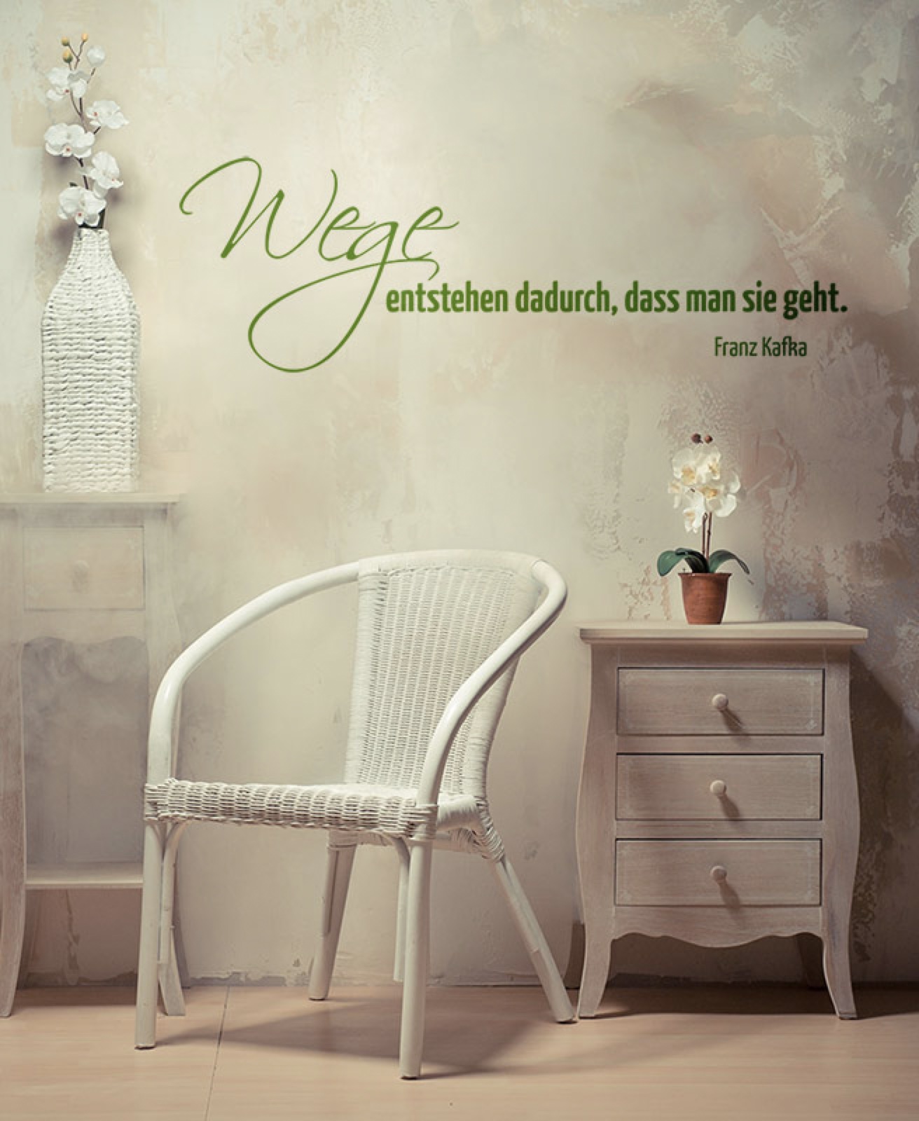 Diese Wandtattoo-Zitate dienen zur Erinnerung an Dinge, die einem persönlich wichtig sind und erinnern immer wieder an das Wesentliche. Sie ermutigen, bauen auf, erheben die Gedanken. Sie erinnern immer wieder daran, wohin man kommen will, oder wie man sein Leben ausrichten will. Bei uns finden Sie fertig gestaltete Wandsprüche und Zitate, speziell für Sie entworfen: wunderschön gestaltete Wandsprüche zum Nachdenken und zum Träumen. Mit unseren Wandtattoosprüchen setzen Sie stilvolle Designakzente in Ihren Wohnräumen.