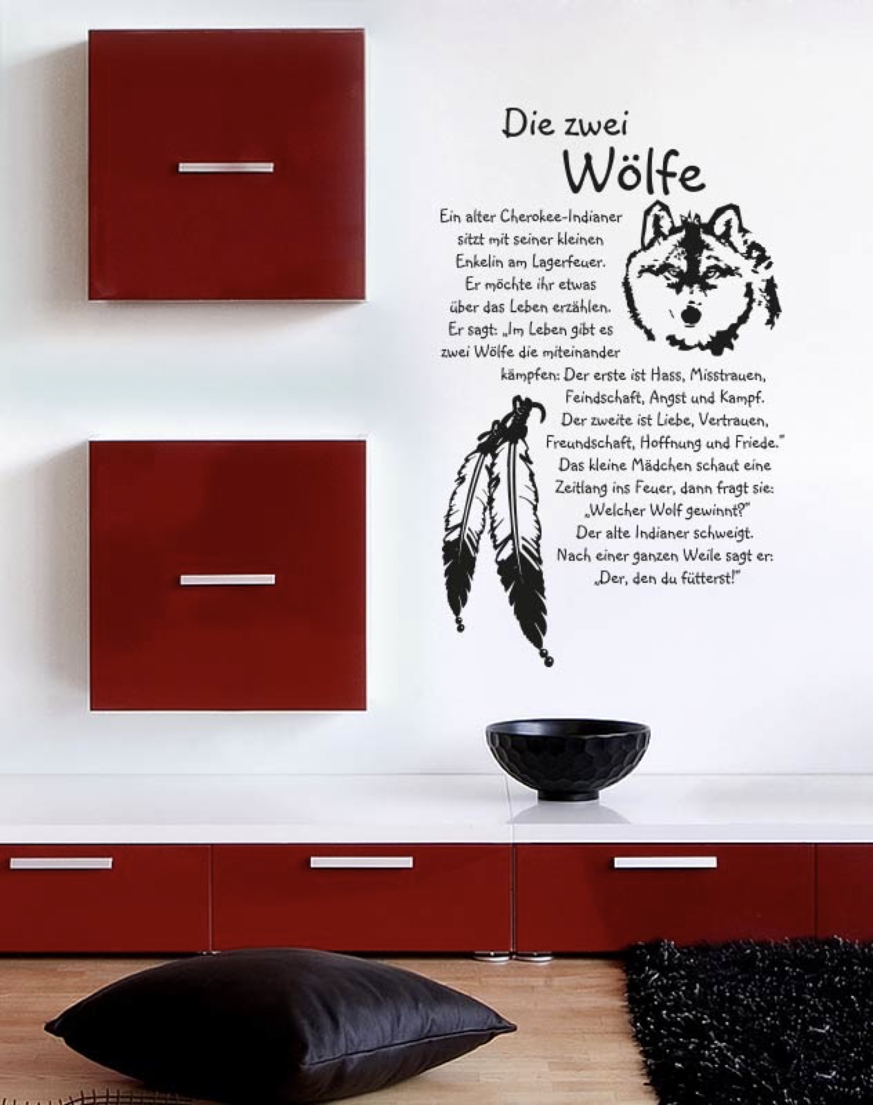 Wandtattoo Ein alter Cherokee-Indianer sitzt mit seiner kleinen Enkelin am Lagerfeuer. Er möchte ihr etwas über das leben erzählen. Er sagt: „ Im Leben gibt es zwei Wölfe, die miteinander kämpfen: Der erste ist Hass, Misstrauen, Feindschaft, Angst und Kampf. Der zweite ist Liebe, Vertrauen, Hoffnung und Friede.“ Das kleine Mädchen schaut eine Zeitlang ins Feuer, dann fragt sie: „Welcher Wolf gewinnt?“ Der alte Indianer schweigt. Nach einer ganzen Weile sagt er: „Der, den du fütterst!“